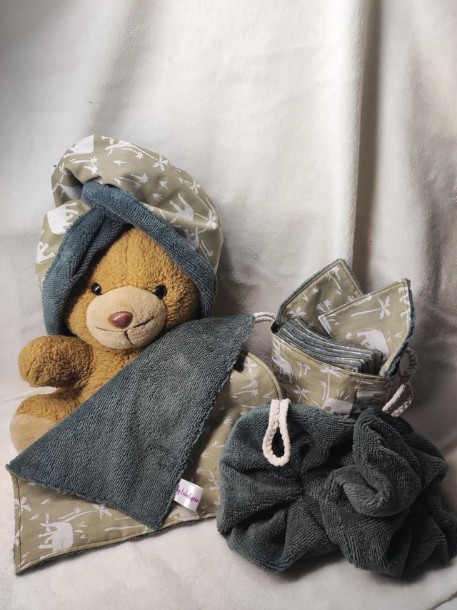 Ensemble comprenant serviette pour cheveux, serviette visage, 2 fleurs de douche et 10 lingettes avec leur panière. Ensemble adéquat pour un moment zen dans la salle de bain... Coton et éponge de bambou tout doux ...Qui fera ce voyage au pays de la zen attitude ?!