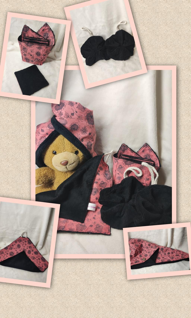 Ensemble visage et douche en coton et éponge de bambou contient une serviette pour cheveux, une serviette pour visage, 2 fleurs de douche et 10 lingettes avec leur panière.